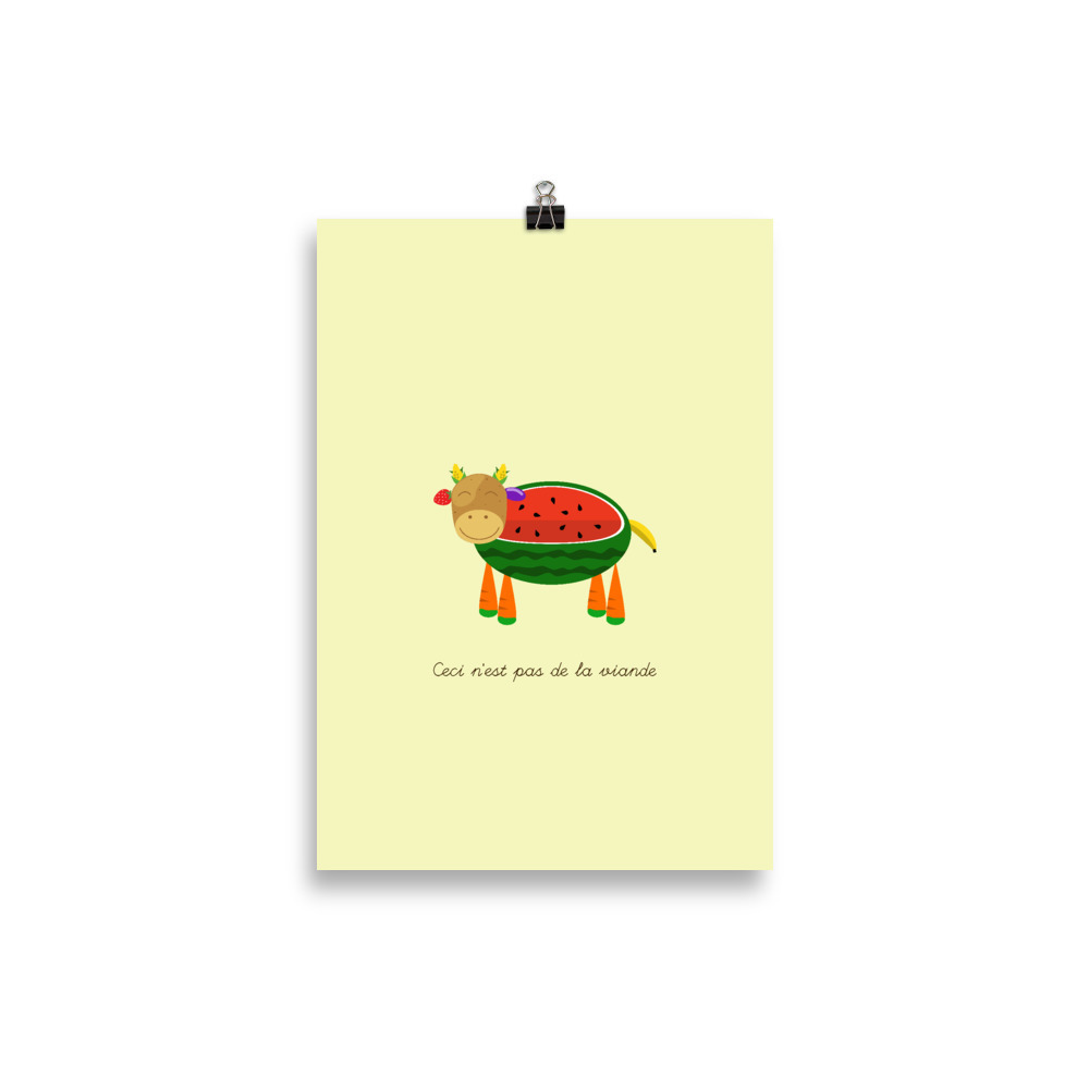 Le tirage sans sous-titre irait bien à côté des autres tirages No Meat Today, mais si vous voulez acheter un seul, je recommanderais le tirage avec le sous-titre "Ceci n'est pas une vache". Pourquoi ? Parce que cela donne encore plus de profondeur à cette illustration. Cette vache n'est pas une vache parce qu'elle représente une vache et non la vache elle-même, mais ce n'est pas non plus une vache parce qu'elle est faite de fruits et légumes.